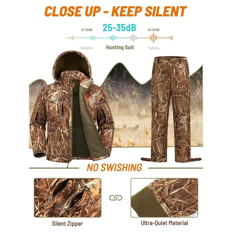 Veste de chasse d'hiver KUI Flyway, isolée, à capuche, imperméable, coupe-vent, design imprimé pour les chasseurs de gibiers d'eau, vêtements de chasse personnalisés