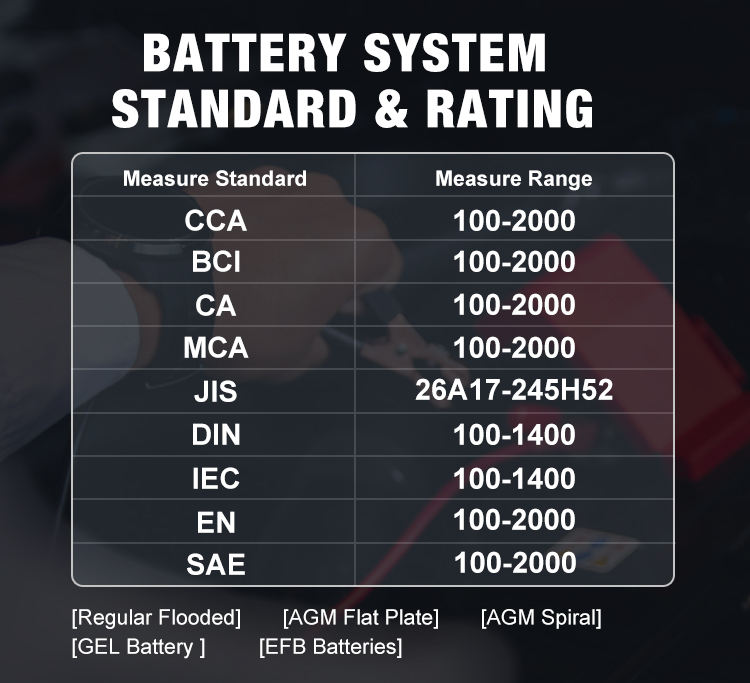 Norme de mesure:CA CCA BCL MCA JIS SAE EN GB DIN CEI 100-2000cca