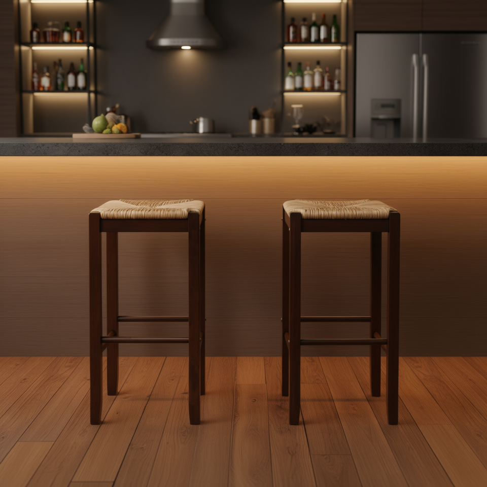 Tabourets de bar Kaden, ensemble de 2, assise en rotin, structure en bois, design traditionnel, mobilier de bar