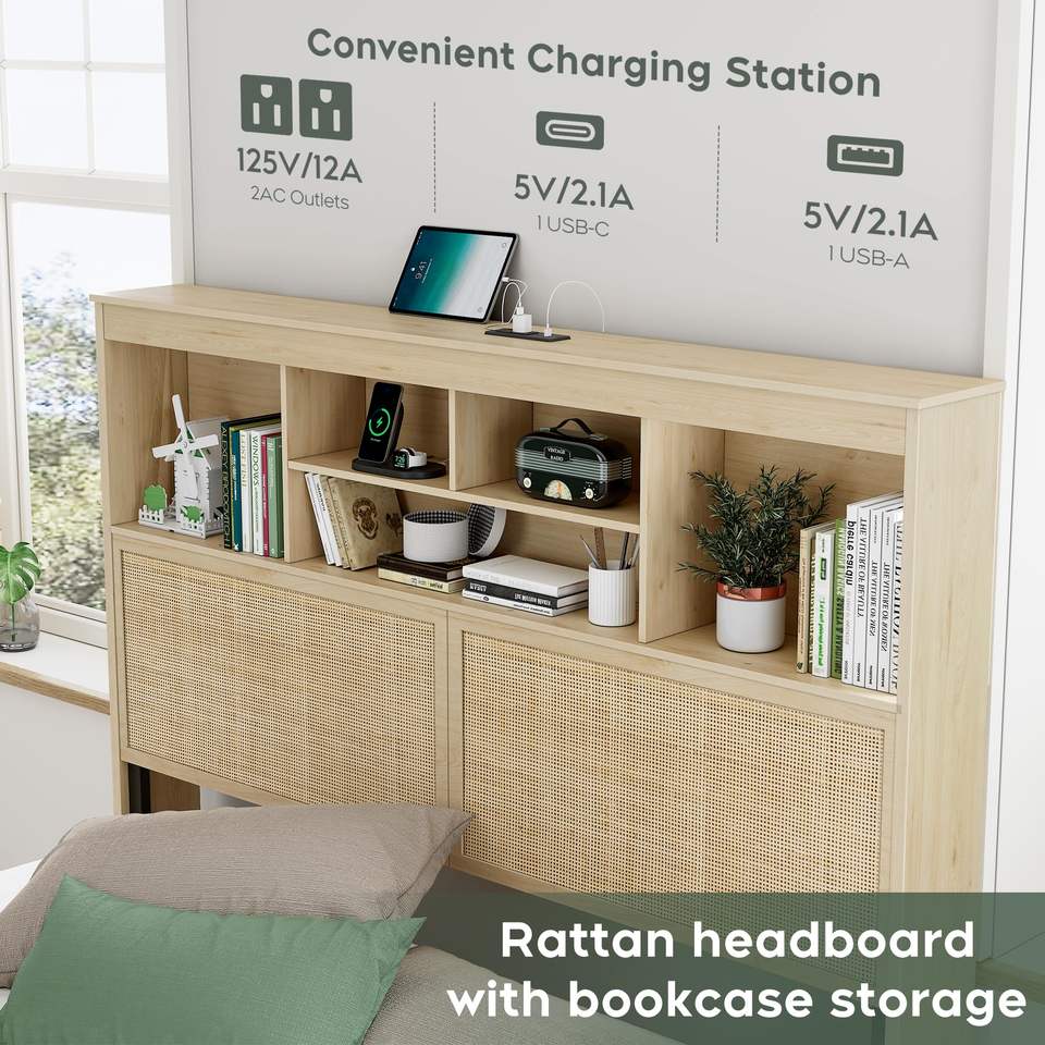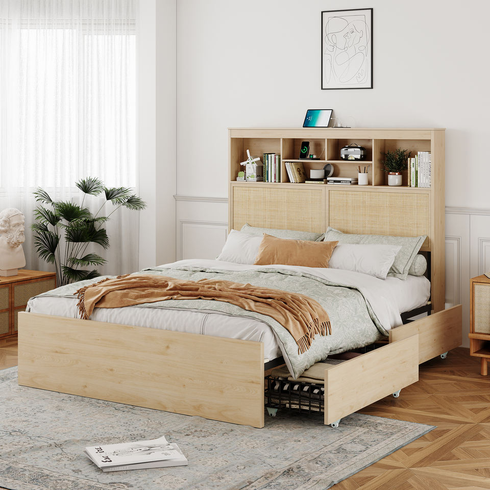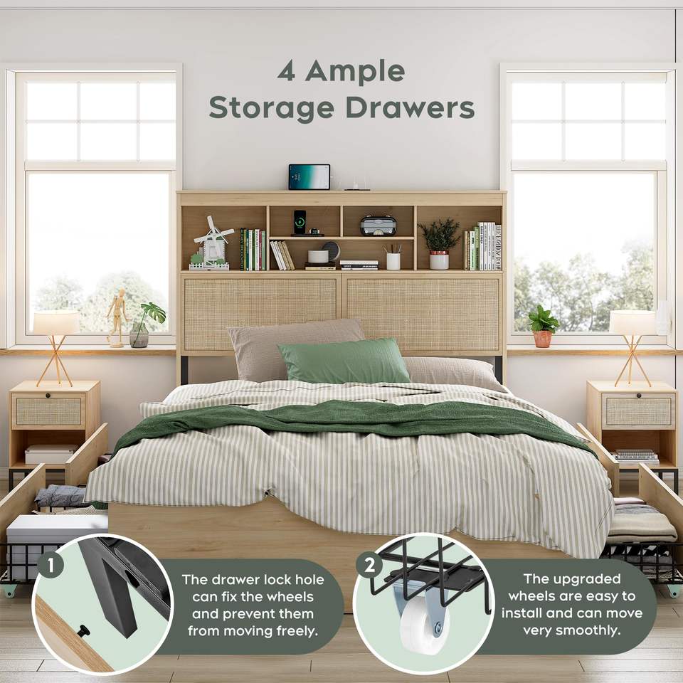 Kainice-Cadre de lit moderne en rotin pour lit queen size avec station de charge USB en bois tendre Plate-forme de rangement et tiroirs Lit intelligent king size