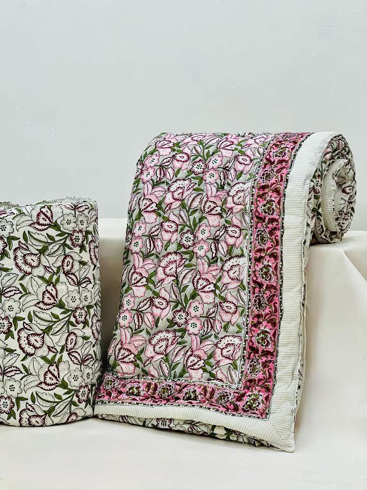 Kantha Floral block print quilt Indian Handmade Reversible Jaipuri Razai Quilt Blanket Indian Hand Block Print Cotton Quilts