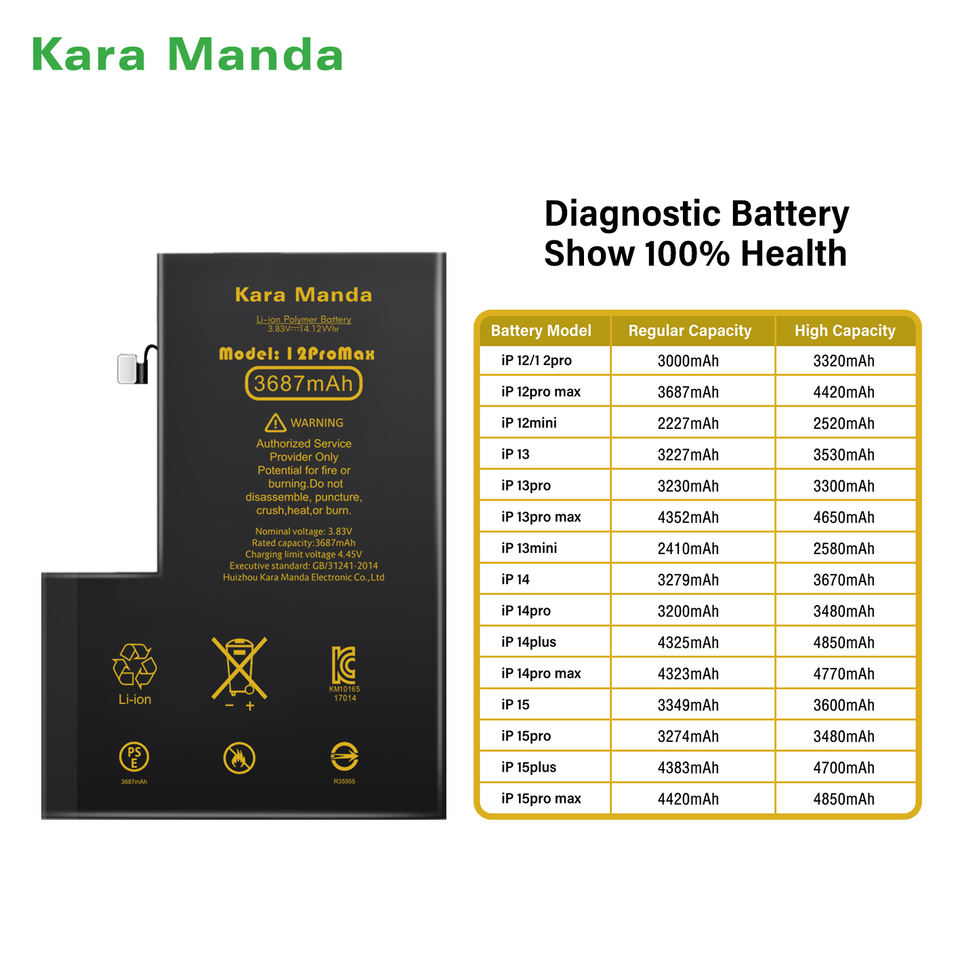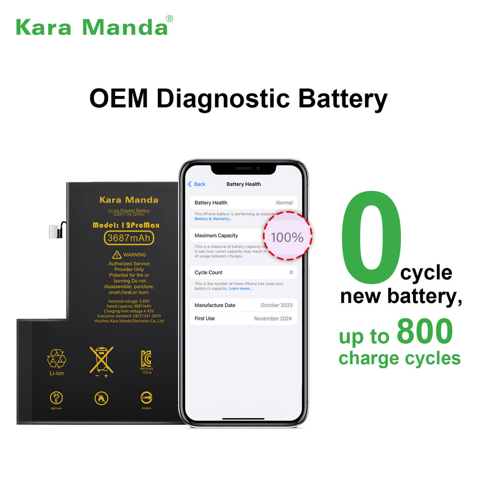 Kara Manda OEM Nouveau 0 Cycle Diagnostic Show 100% Batterie de téléphone de santé pour batterie iPhone sans soudure pour batterie iPhone 12 Pro Max