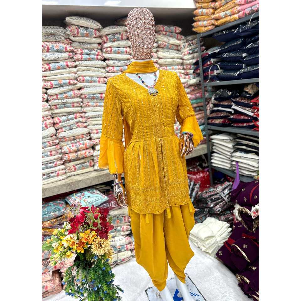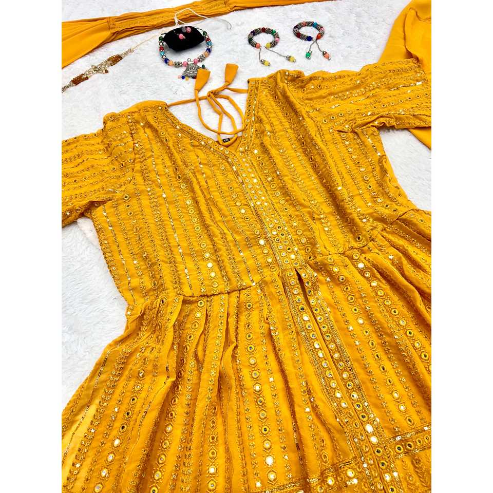 Combinaison de soirée jaune Kavya Fab avec haut et bas et dupatta fantaisie pour les occasions spéciales, taille L