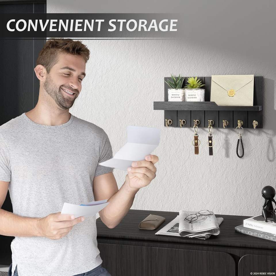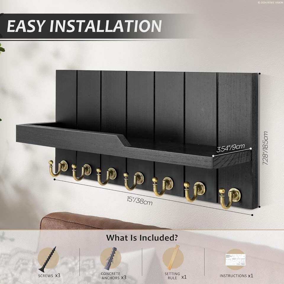Porte-clés et porte-lettres style ferme, étagère flottante de 15 pouces, 7 crochets robustes pour clés, décoration murale d'entrée, porte-clés rustique pour la maison