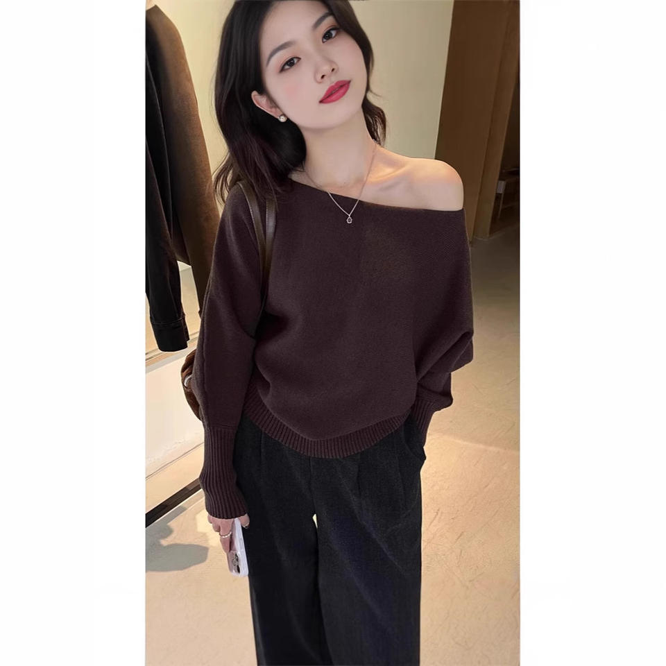 Khaki Off-The-Shoulder Woven Knit Nylon/Cotton Patchwork Top for Women Autumn Luxury Above Knee Anti-Wrinkle Sweater Inner Layer