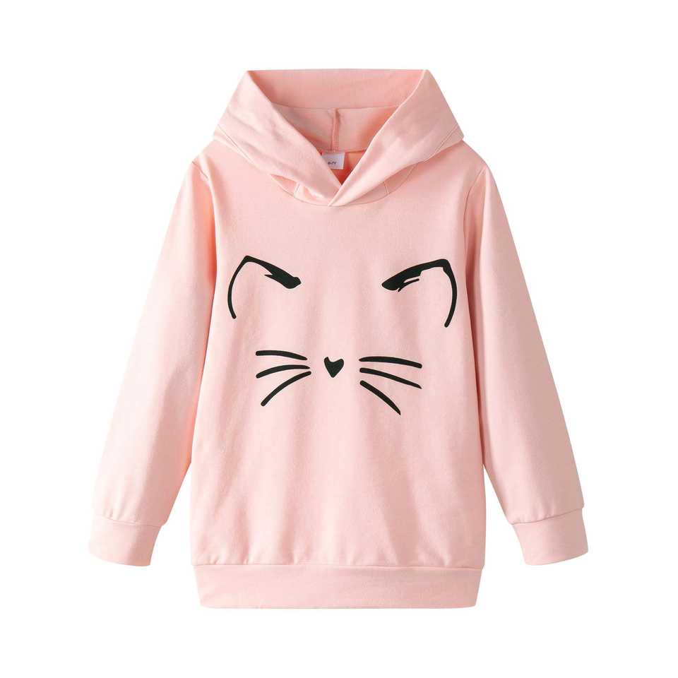 Pull-over à la mode pour enfants avec logo personnalisé, sweat à capuche imprimé chat ajusté pour filles, vêtements d'extérieur d'hiver de couleur unie avec capuche brodée