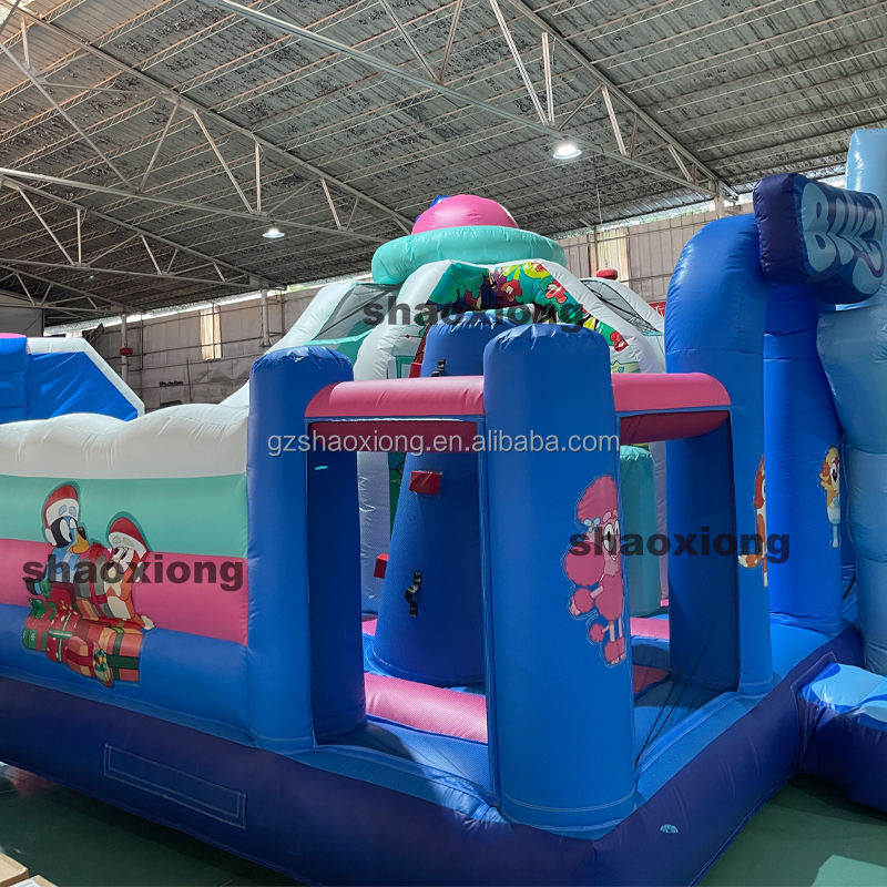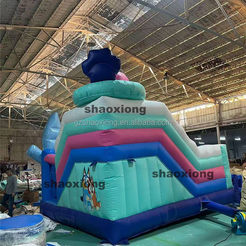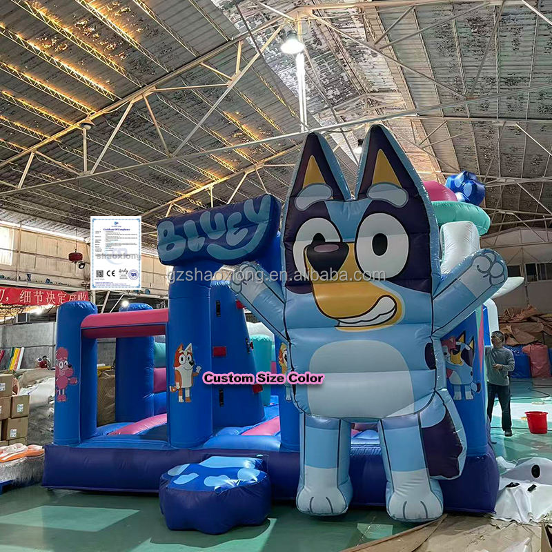 Château gonflable commercial d'extérieur pour enfants, thème Bluey, avec toboggan et zone de saut