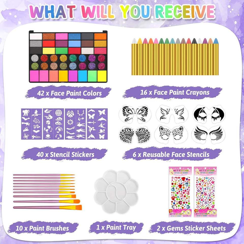 Kit de peinture pour le visage pour enfants 42 couleurs non toxiques Peinture pour le visage 16 crayons 6 pochoirs réutilisables 40 collants pour Halloween Peinture pour le visage corporel