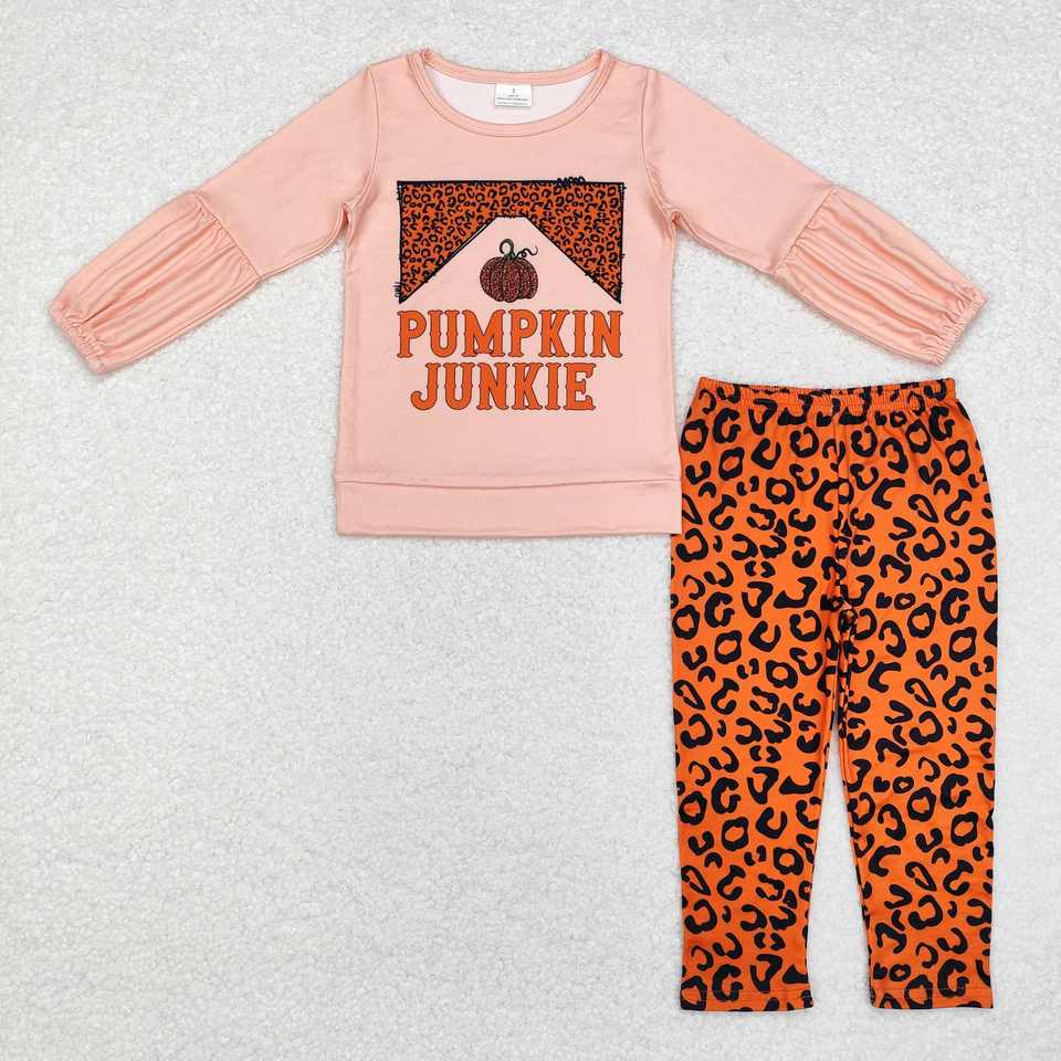 Enfants Filles Automne Conception En Gros Vêtements Ensemble Vert Rayé Citrouille À Manches Longues Haut Avec Orange Legging Outfit