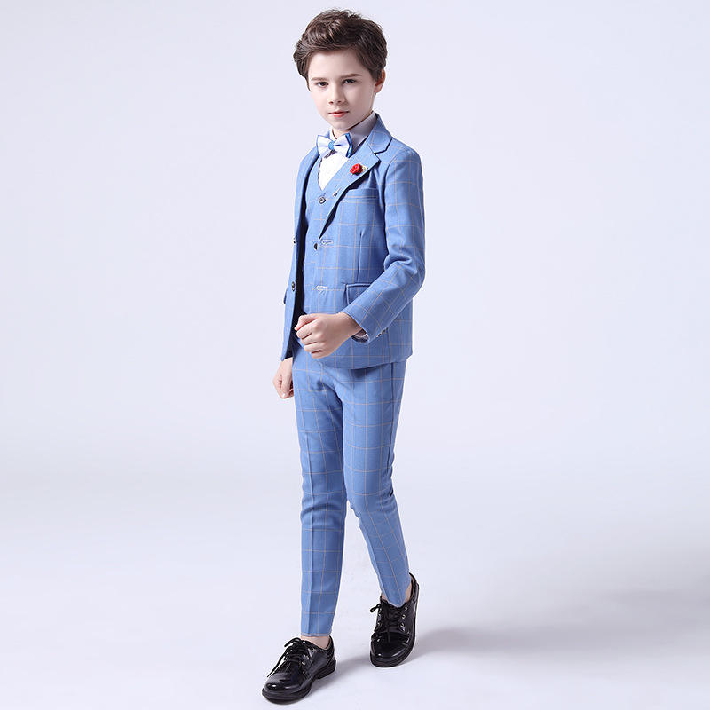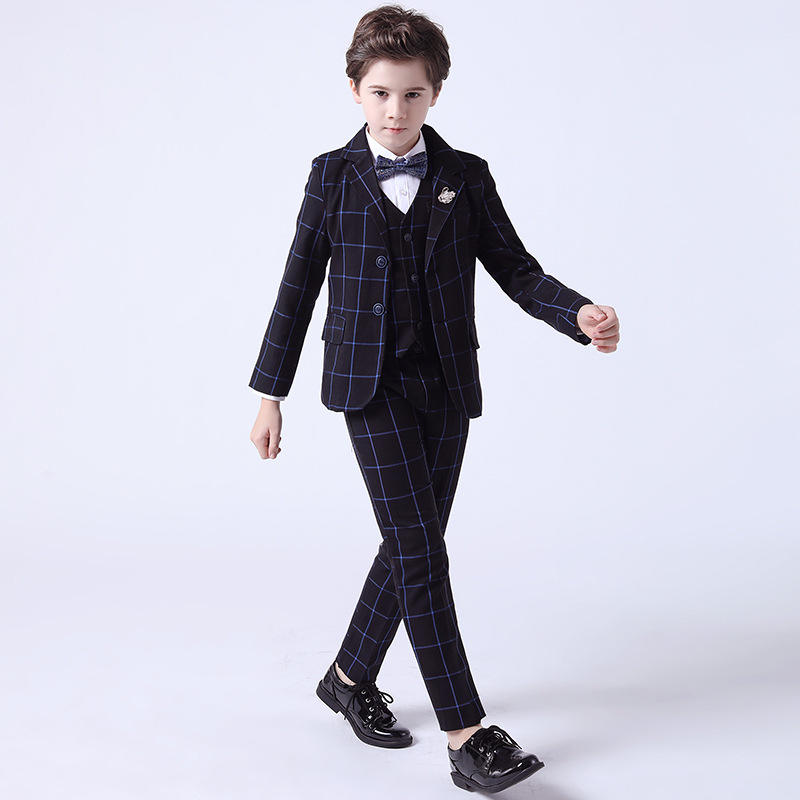 Ensemble de costumes à carreaux pour enfants printemps/automne pour garçons Performance d'hôte Vêtements de mariage pour enfants 4 pièces Blazer gilet pantalon nœud