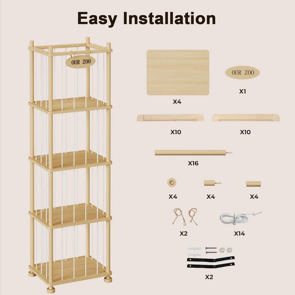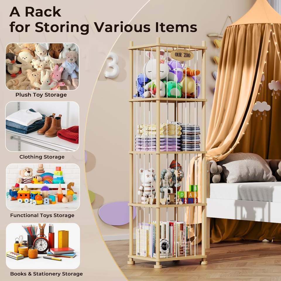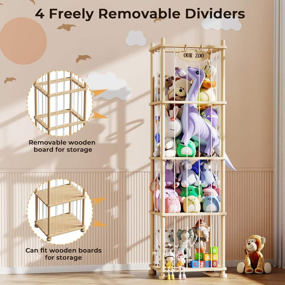 Organisateur de rangement pour animaux en peluche pour enfants, étagère de rangement pour jouets en bois de pin massif avec étagères amovibles, grand support pour animaux en peluche