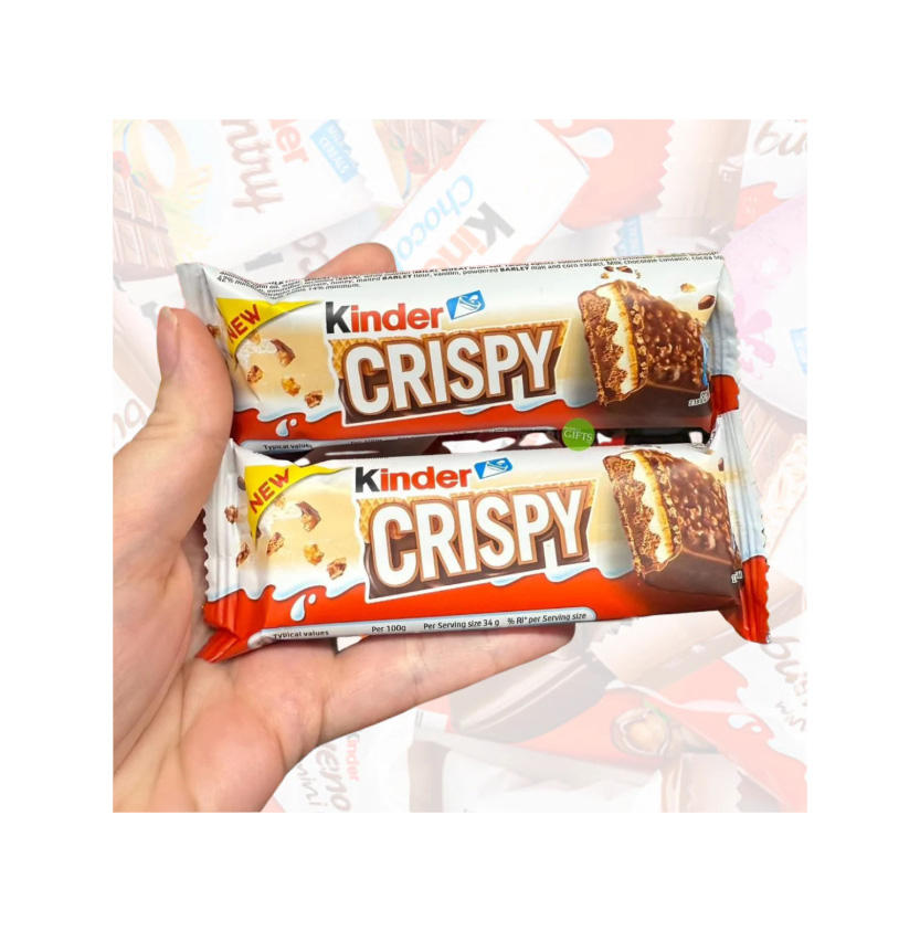 Barre de céréales croustillante Kinder Crispy 34g fourrée à la crème de noisettes et au lait, enrobée de chocolat, commande en gros disponible