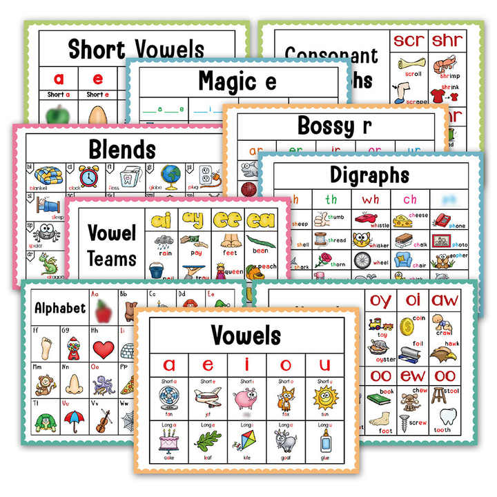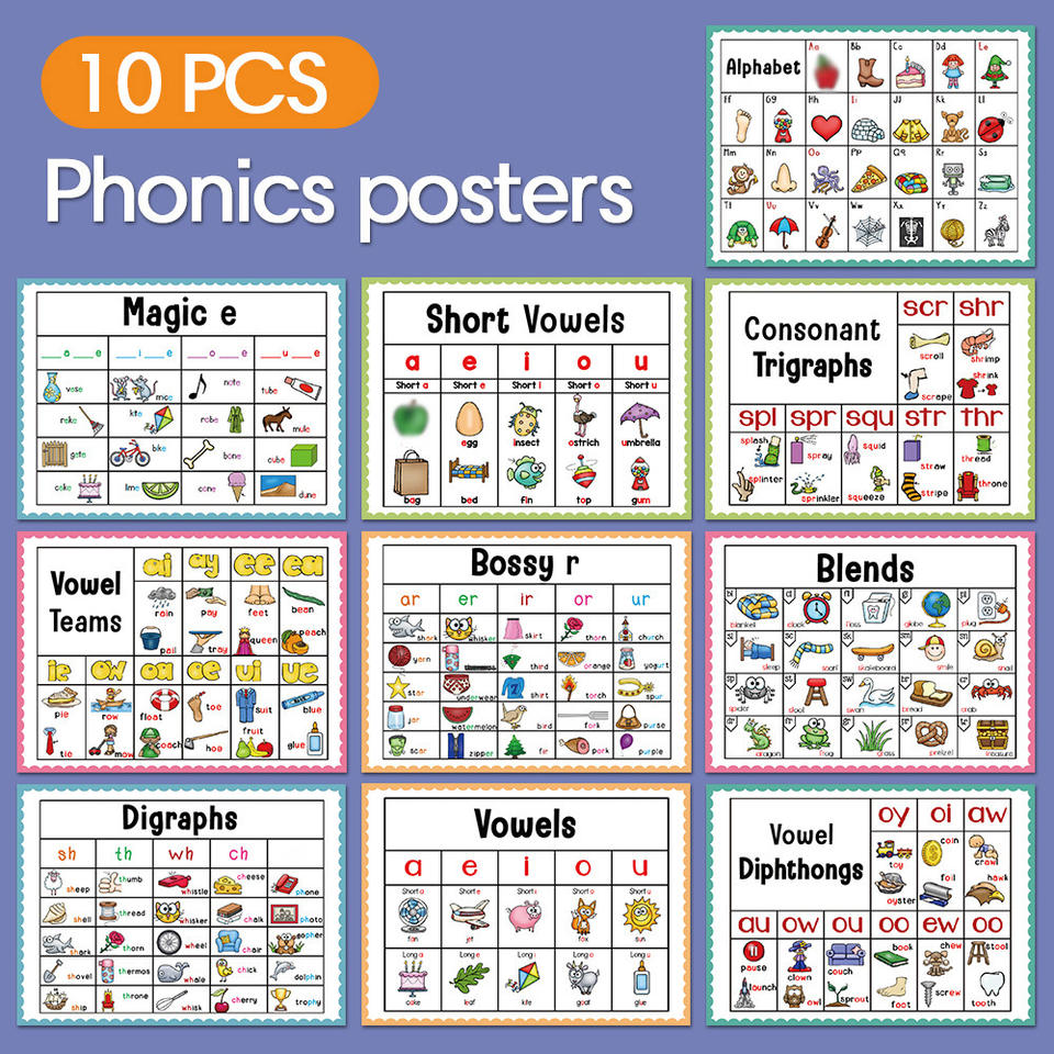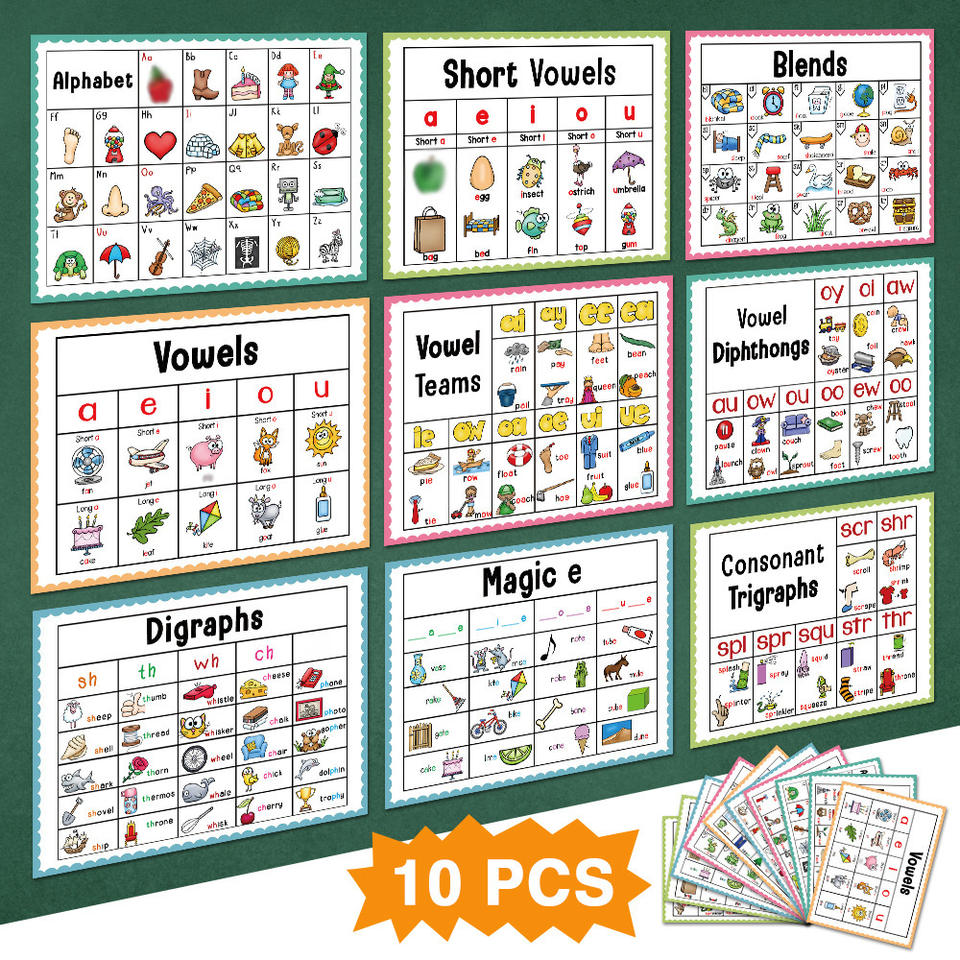 10 anglais Phonics Posters Language Arts Charts pour les enfantsNom du produit