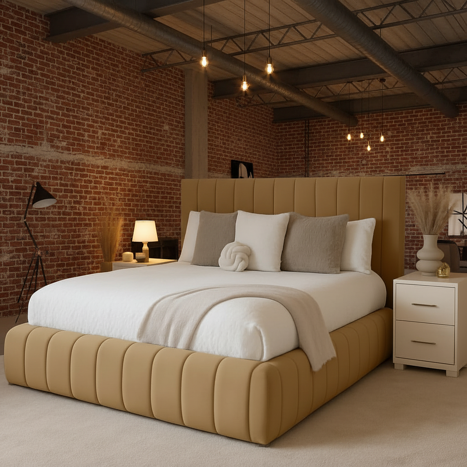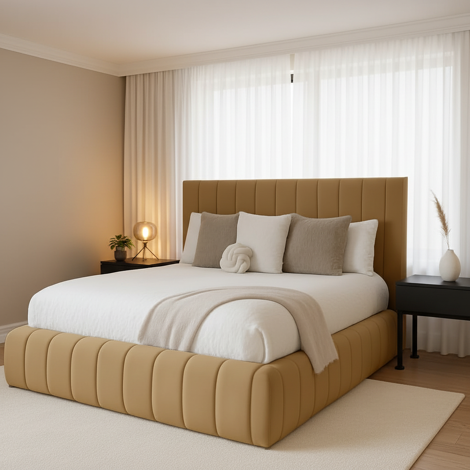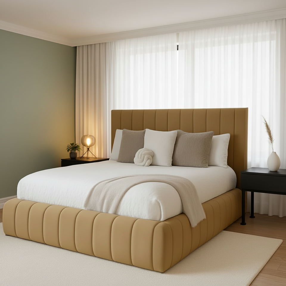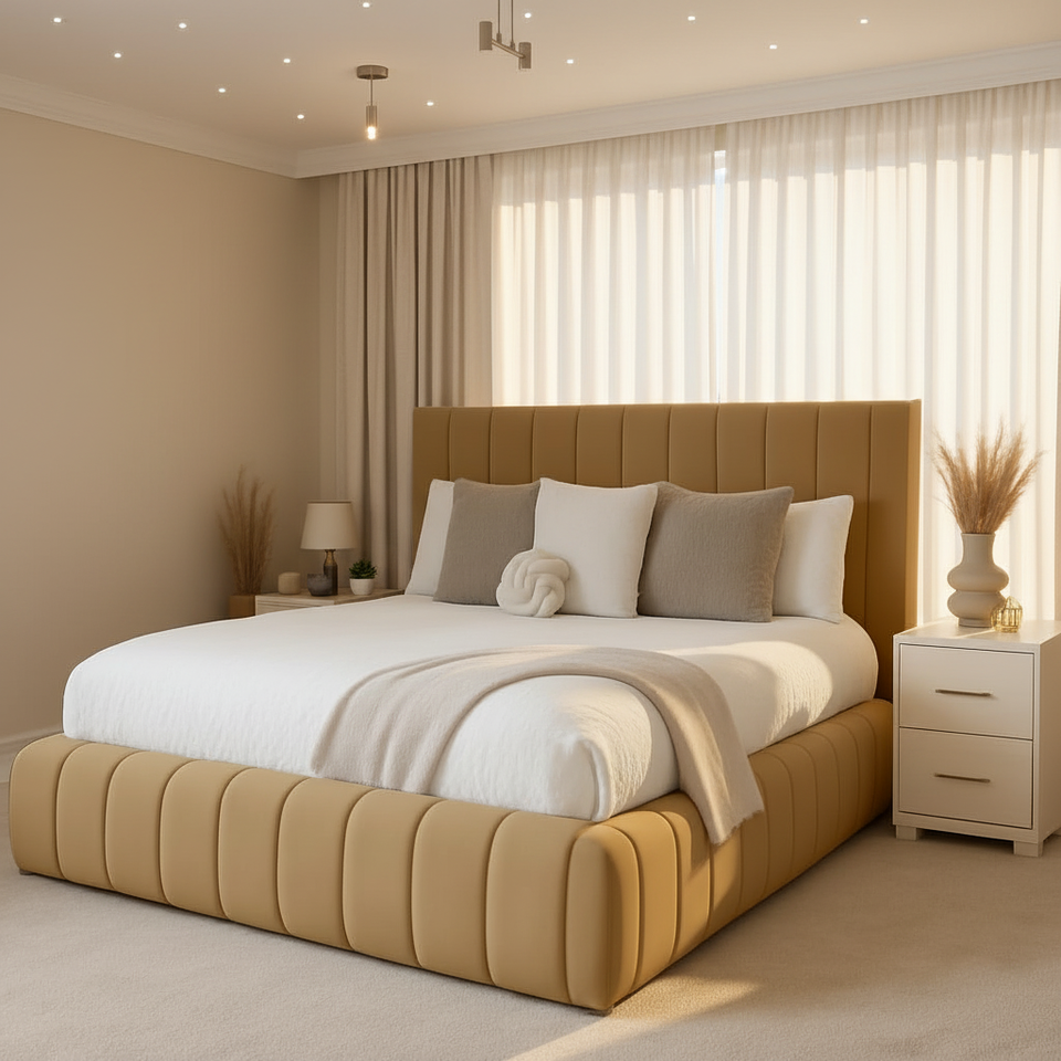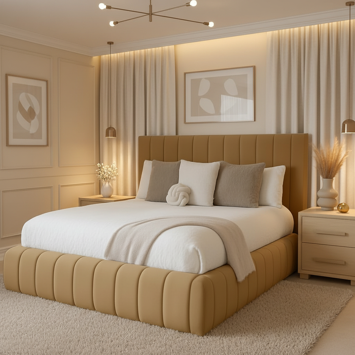 Cadre de lit king-size avec tête de lit, lit rembourré en velours crème, lattes en bois pour meubles de chambre à coucher