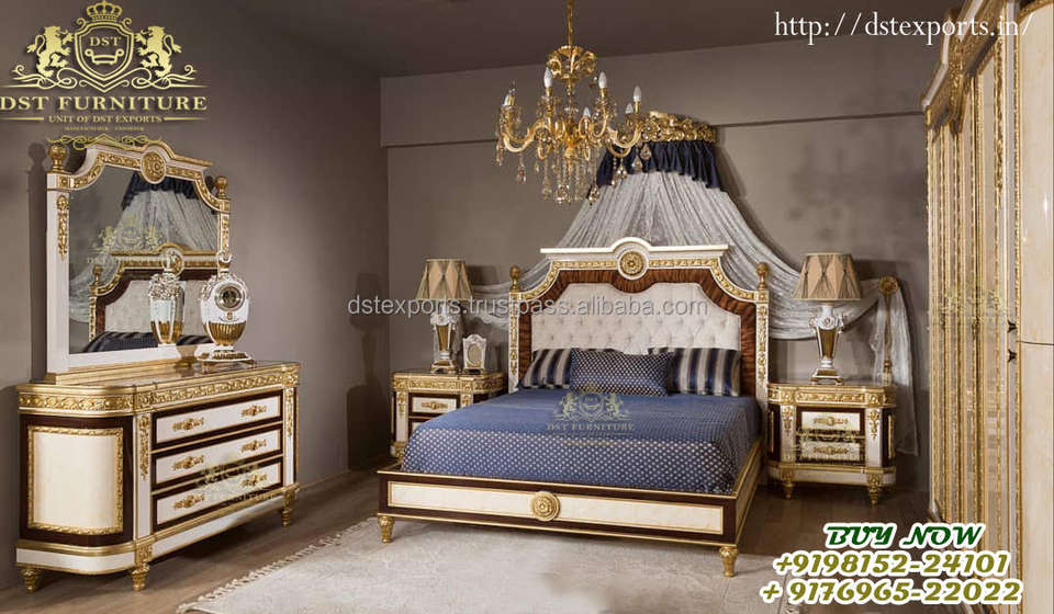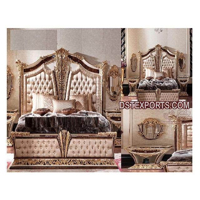 Meubles de chambre à coucher luxueux de style royal, lit king-size et tables de chevet, dossier haut, sculpté en or