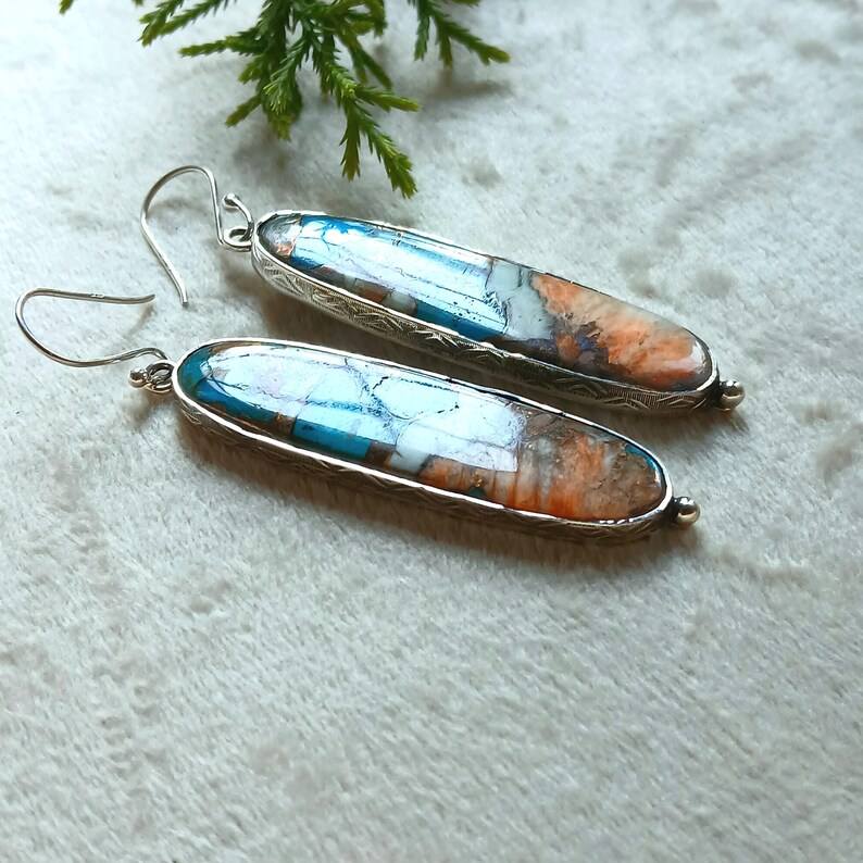 Kingman Oyster Copper Turquoise Gemstone Earrings in 925 Sterling Silver Long Oval Design Gift for Her Handmade Jewelry