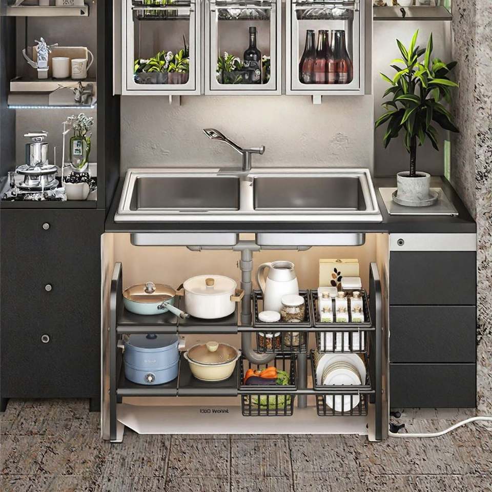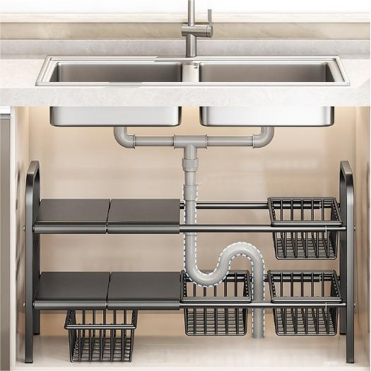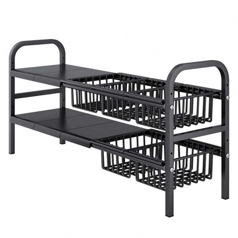 Organisateur de cuisine à 2 niveaux en métal, type autoportant, pour évier, avec plateau de rangement extensible à longueur réglable