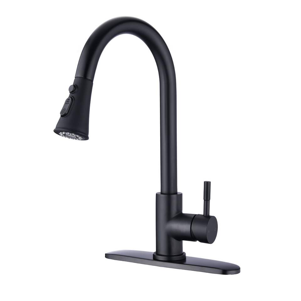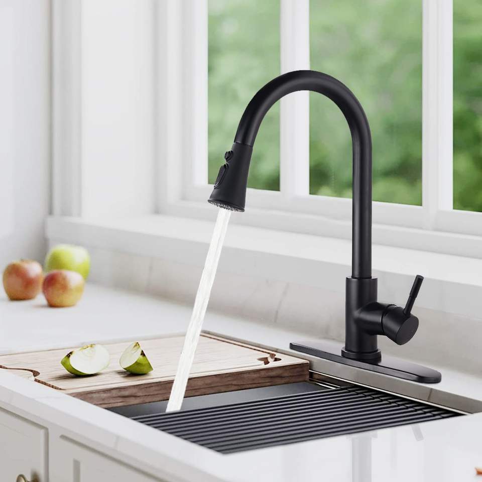 Robinet de cuisine noir mat en acier inoxydable avec douchette extractible, montage sur plan, monotrou, design moderne