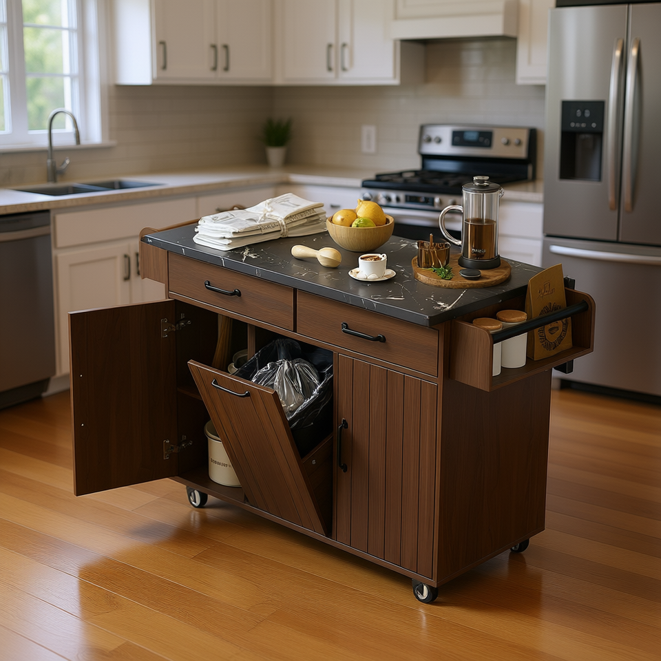 Chariot de cuisine avec poubelle intégrée, étagère réglable, tiroir, chariot roulant, bois de noyer brun moderne, 1 tiroir, 2 étagères