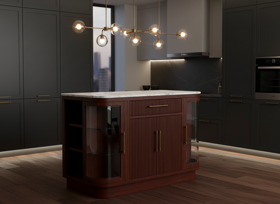 Îlot de cuisine, armoire de cuisine, table de cuisine ronde en verre avec chaises, mobilier d'intérieur, meubles en bois, vente en gros