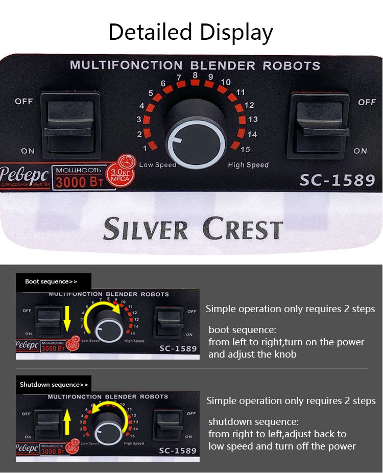 Caractéristique:Vitesse variable, broyage de glace, moteur en cuivre pur, étanche, conception à levage de bol