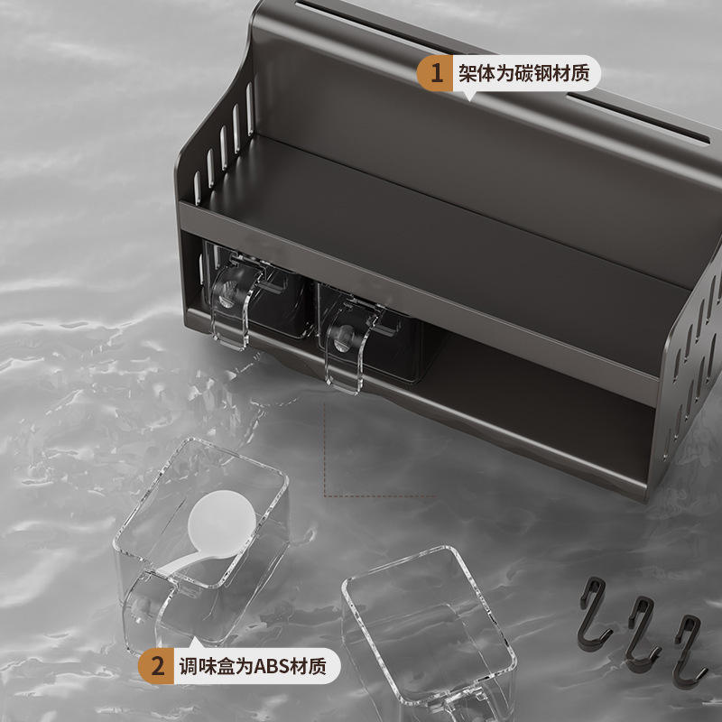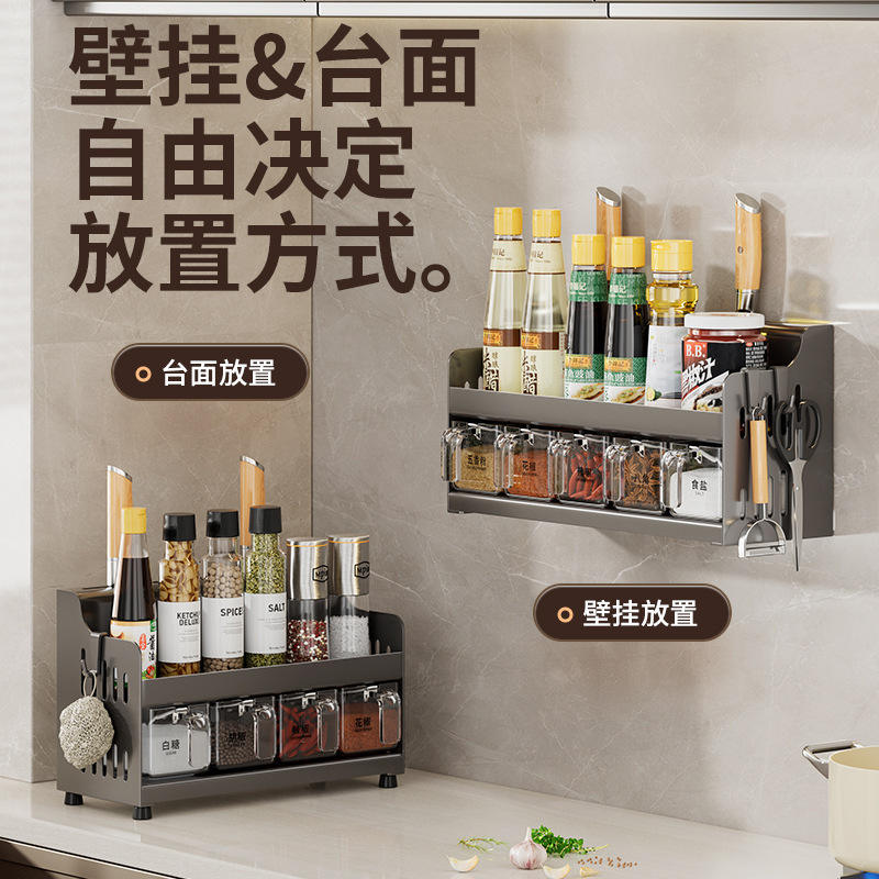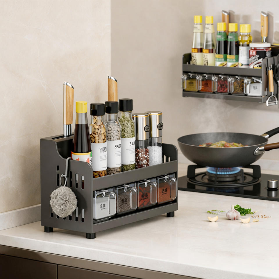 Étagère à épices de cuisine avec porte-couteaux, boîte de rangement en acier au carbone pour comptoir, installation sans perçage, multifonctionnelle pour condiments