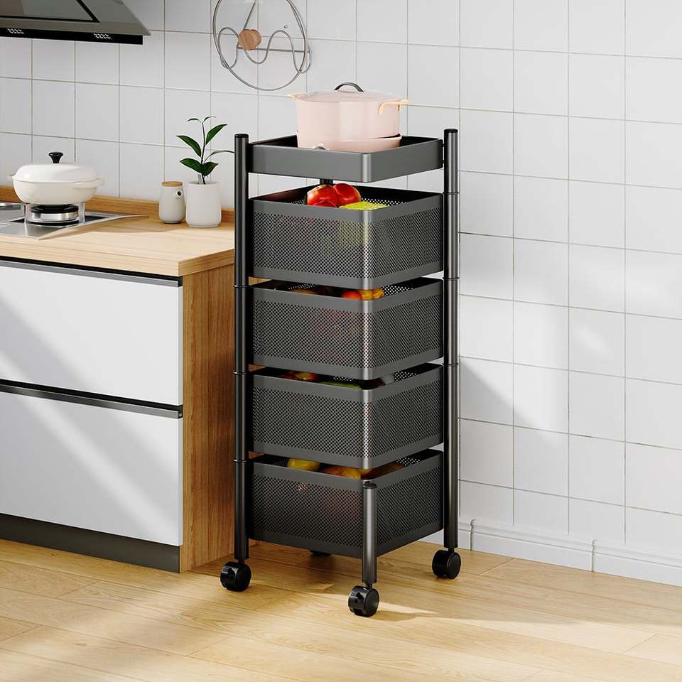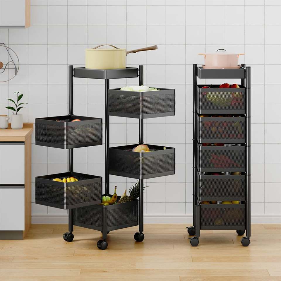 Étagère de rangement de cuisine sans assemblage, chariot de rangement rotatif en métal sur roulettes avec panier