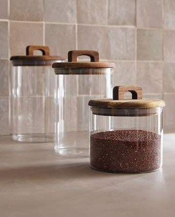Pot en verre avec couvercle en bois, idéal pour la cuisine, parfait pour le stockage quotidien des épices, des collations, des fruits secs, du thé et du café.