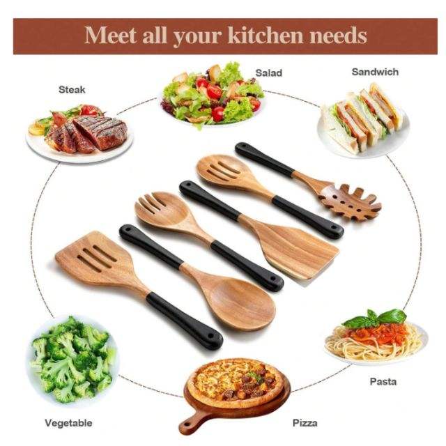 Nom du produit:Cuillère En Bois Naturel Ensemble De 6 Pcs Avec Poignée Noire