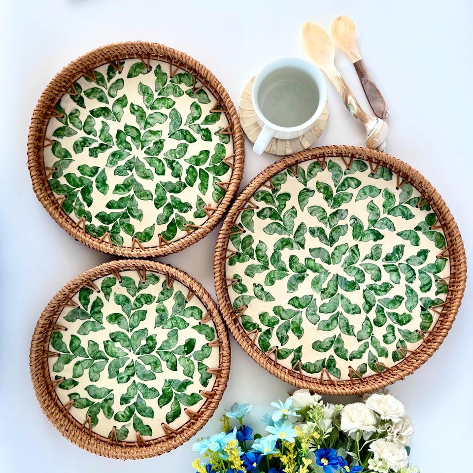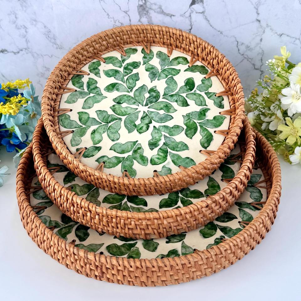 Kitchen organizer handcrafted rattan MOP tray top selling mother of pearl inlay trays shell coating platter