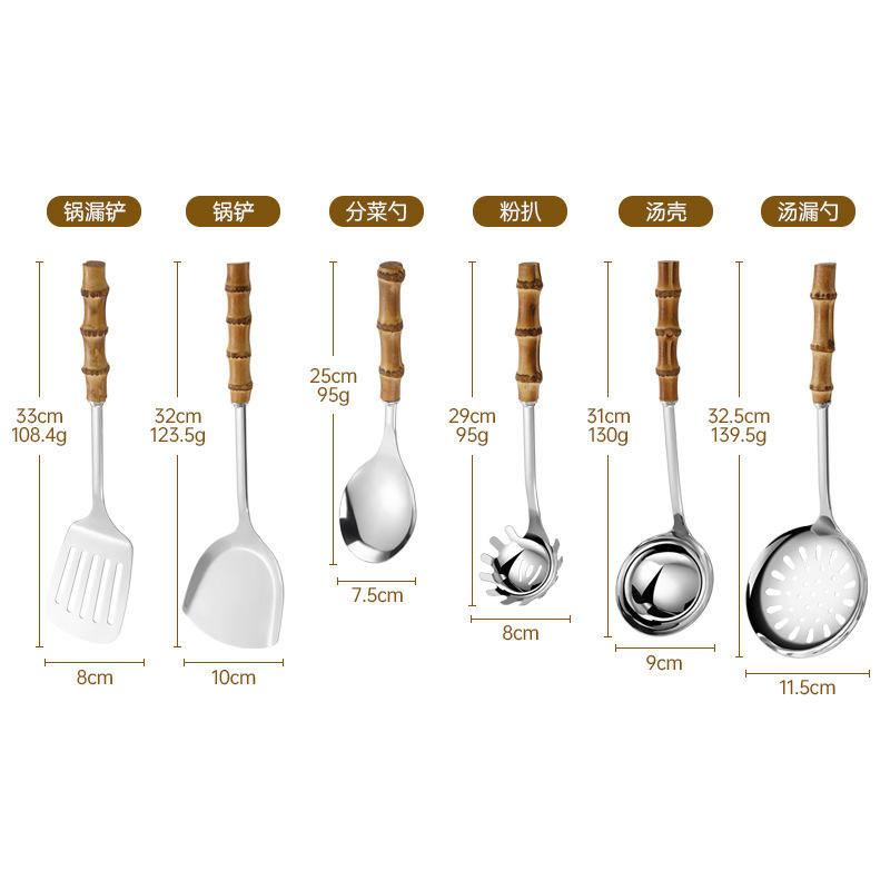 Ensemble d'ustensiles de cuisine et de vaisselle avec manche en bambou en acier inoxydable cuillère à soupe passoire spatule pour la cuisine ustensiles ménagers