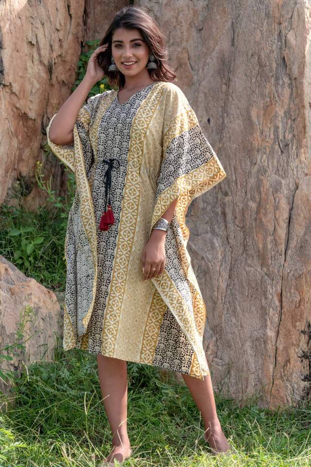 Robe caftan bohème en coton imprimé floral été manches trois-quarts longueur genou caftan taille naturelle lavable mariages proms
