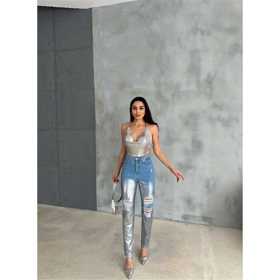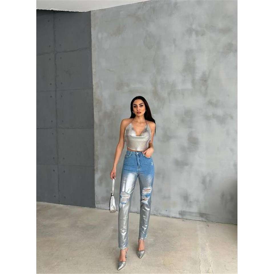 Jean en denim pour femme, taille haute, coupe crayon, effet froissé aux genoux, détails en feuille d'aluminium, taille basse, coupe skinny, taille 2XL, respirant, couleur argent