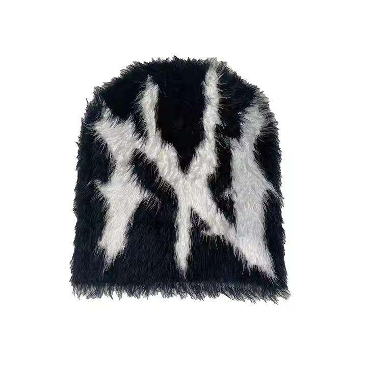 Knitwear Manufacturers Custom Logo Jacquard Print Reversible Mohair Beanie Knitted Streetwear Fluffy Winter Hat