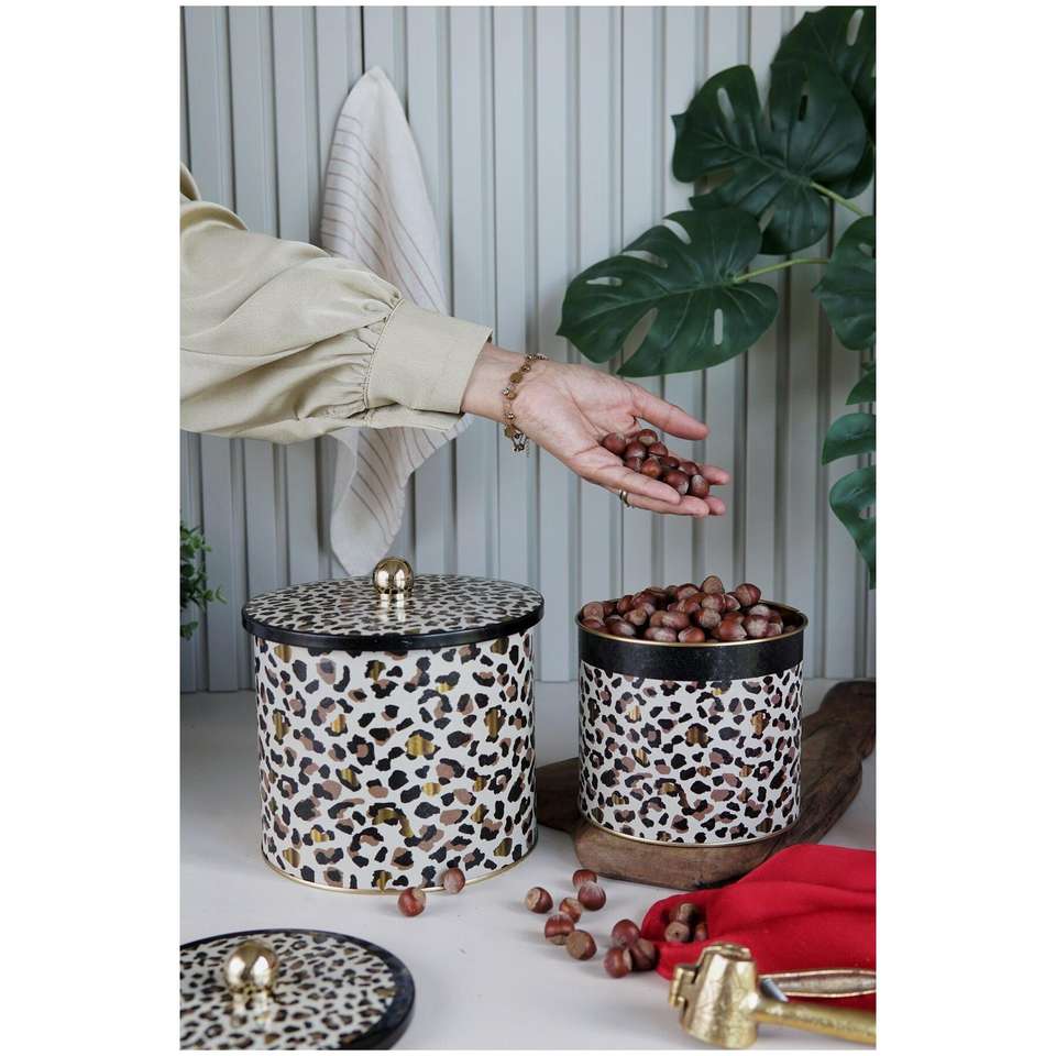 Ensemble de boîtes rondes en métal Kontensan, diamètre 175x155 - diamètre 140x125, poignée à bouton (lot de 2), motif léopard doré, design Leo