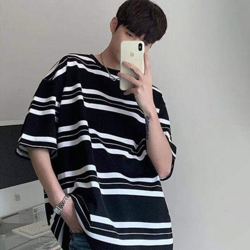 T-shirt court rayé de style coréen, rétro américain, bloc de couleur, demi-manches, tendance estivale pour hommes, haut décontracté tendance