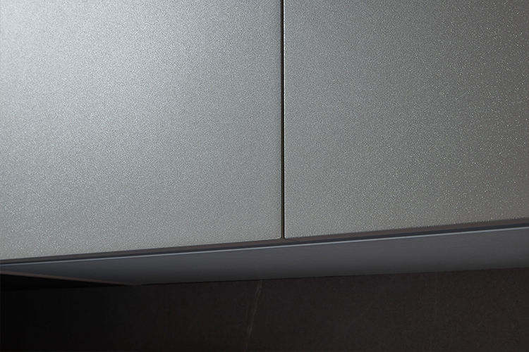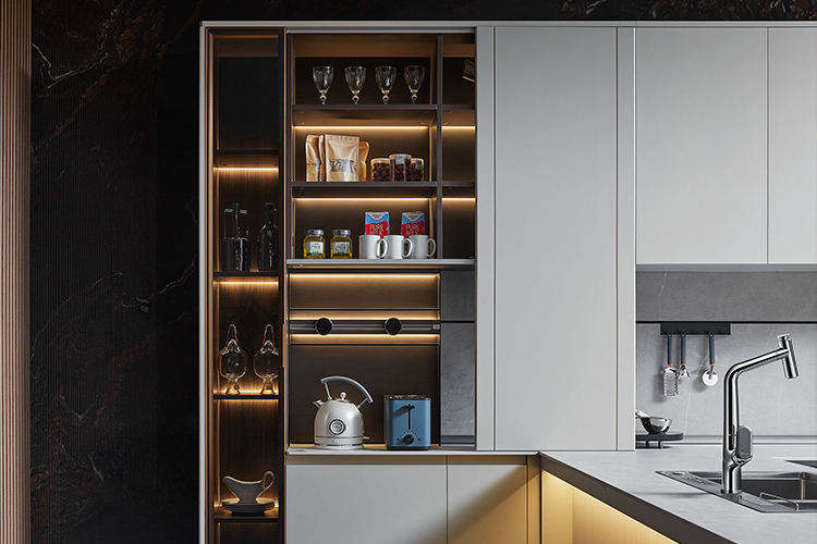 Armoires de cuisine contemporaines en forme de L, laquées brun doré, texture métallique, avec armoires à vin
