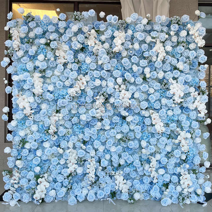 Panneau de fond mural floral L04 bleu 8 pieds x 8 pieds, 3D 5D, tissu enroulable, fleurs artificielles en soie rose pour la décoration de fond de mariage