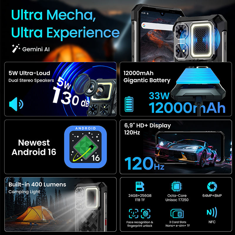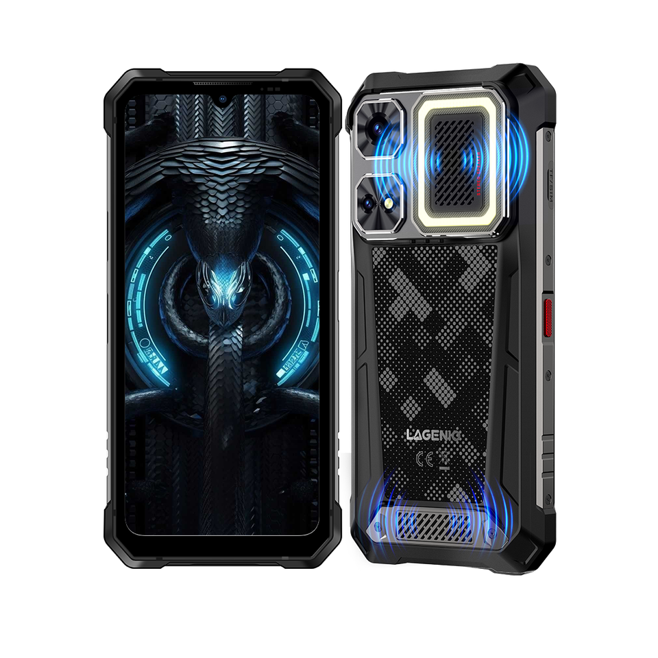 Smartphone robuste LAGENIO Rhino 1 Pro, compatible ESIM, batterie 12000 mAh, appareil photo 64 MP, NFC, 8+256 Go, Android 16, lampe de camping intégrée