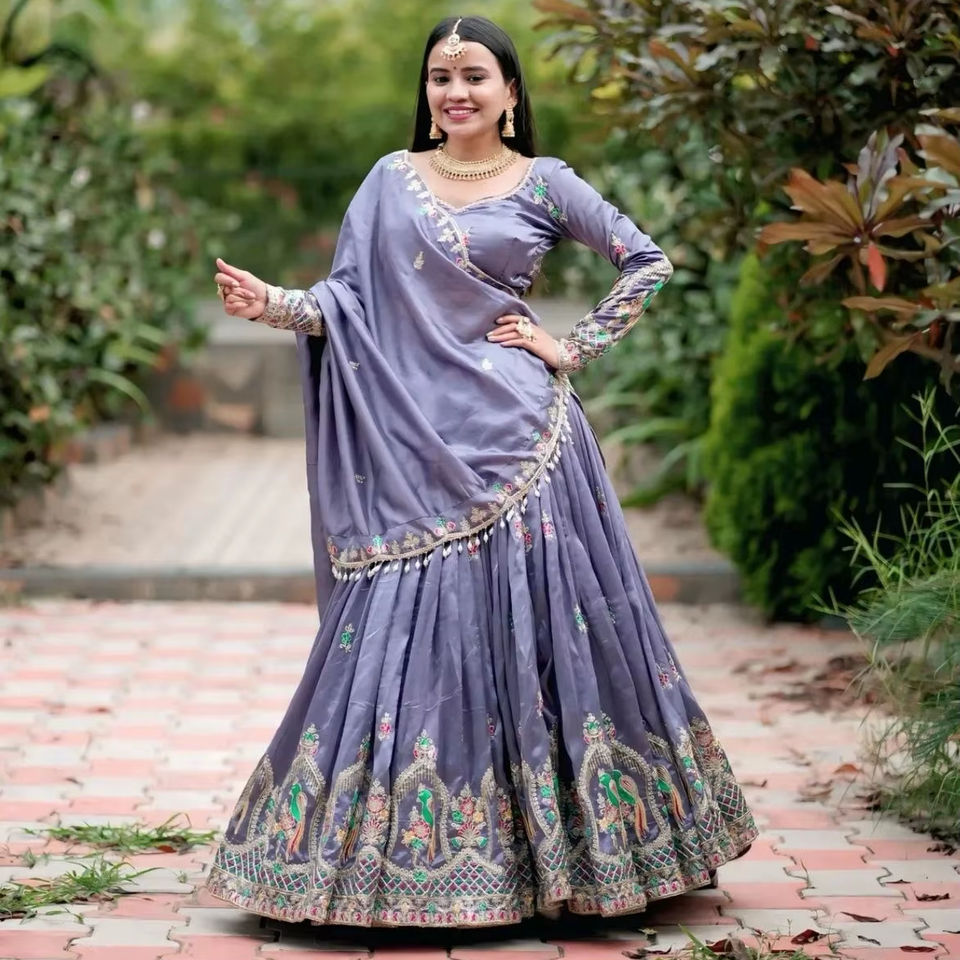 LAHENGA CHOLI DUPATTA EN SOIE CHINON AVEC BRODERIE À LA MAIN AU FIL