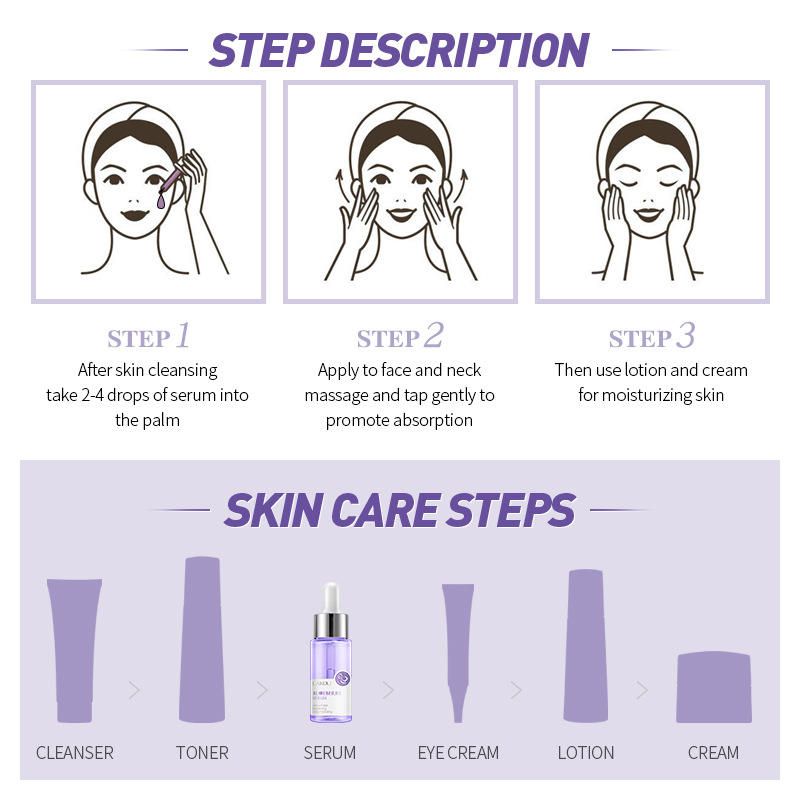 LAIKOU Extrait de fruit de myrtille Hyaluronate de sodium Tremella Fuciformis Polysaccharide Réduire les rides du visage Sérum végétalien lisse