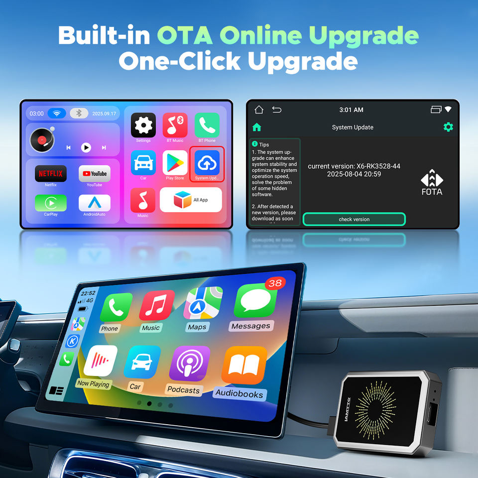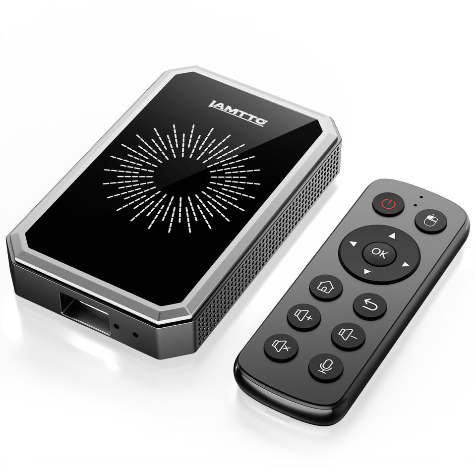 LAMTTO Boîtier AI 4-en-1 Adaptateur sans fil CarPlay et Android Auto pour la diffusion en streaming de Netflix/YouTube/TikTok, télécommande, écran partagé