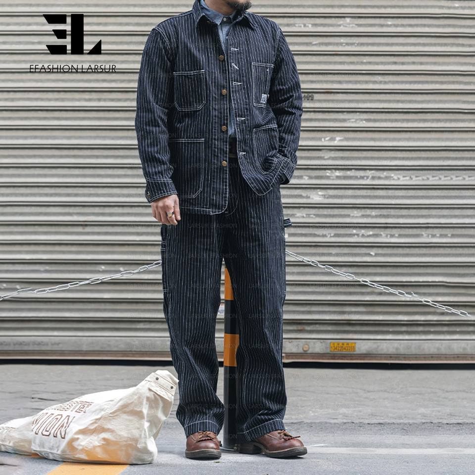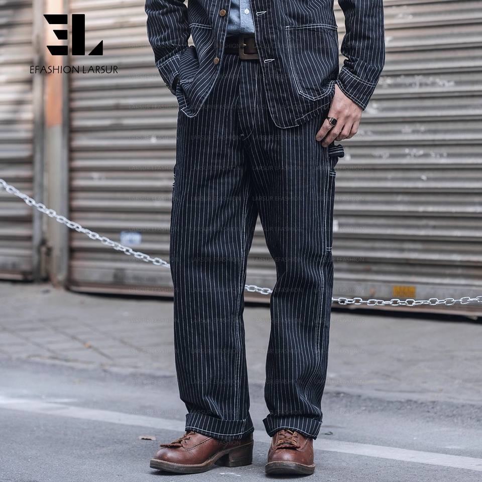 LARSUR Pantalon de menuisier en denim rayé indigo personnalisé en usine en détresse Délavé Jean automobile Wabash Railway Railroad pour hommes