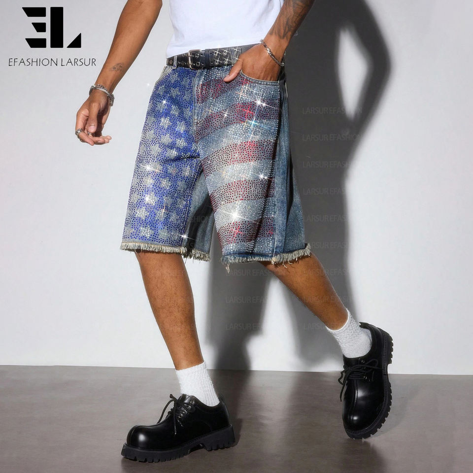 Shorts en jean LARSUR personnalisés, fabriqués en usine, avec des bords bruts, ornés de strass et de diamants, style baggy, déchirés, scintillants, shorts en jean, jorts