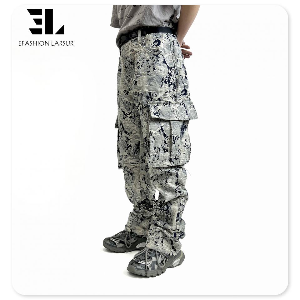 LARSUR Logo personnalisé OEM ODM Jeans empilés pour hommes Jeans jacquard à bords bruts Jeans évasés Pantalons en tapisserie délavée pour hommes