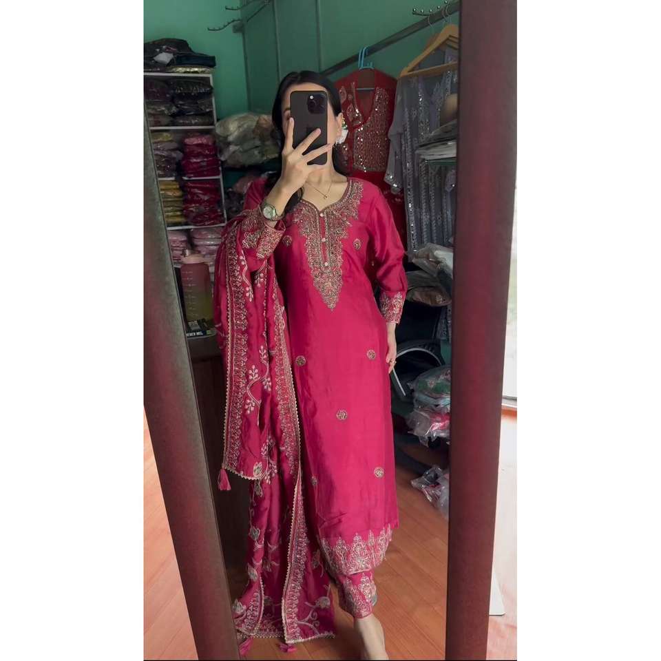 DERNIÈRE BRODERIE CHINON SEQUENCE TRAVAIL HAUT BAS AVEC DUPATTA ROSE