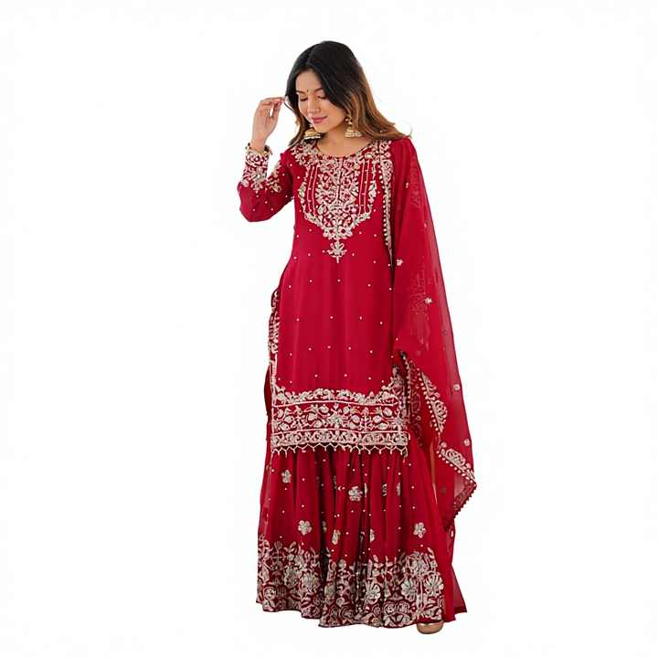 Lancement de nouveaux modèles de Sharara Palazzo de créateur, modernes et festifs, en tissu lourd de type faux géorgette, avec broderies Dori et travail de sequins et de fils.