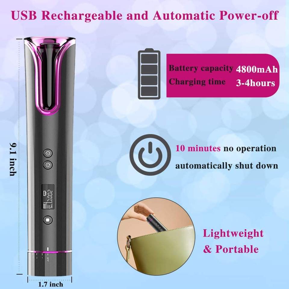 Fer à friser automatique avec affichage LCD et heure Fer à friser automatique Baguette à friser portable et rechargeable par USB