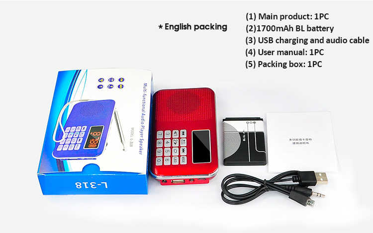 Packing include: 1*FM radio MP3 player speaker, 1*rechargeable 1700mAH BL battery, 1*USB charging and AUX cable, 1 colorful gift box and one white box/pc, 100pcs/ctn, carton size:34*31.5*54.5cm,