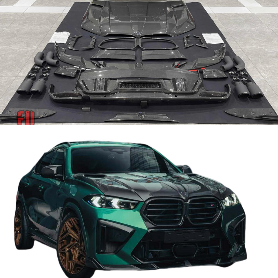 Kit carrosserie en fibre de carbone de style LD pour BMW X6M F96, lèvre avant en fibre de carbone, jupe latérale, diffuseur arrière, spoiler, capot, kit carrosserie
